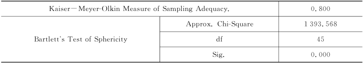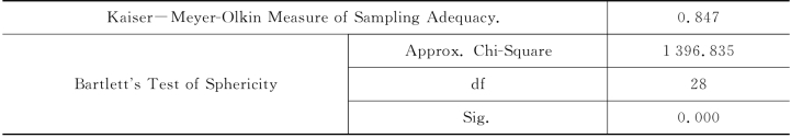 如表4-25所示,KMO值为0.863,样本的充分水平较高,超过了因子分析的样本限制条件;Bartlett球度检验值为1 396.835,显著性水平为0.000,说明各题项之间相互关联,提取公共因子是有条件的。