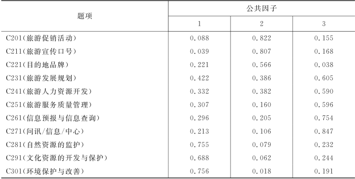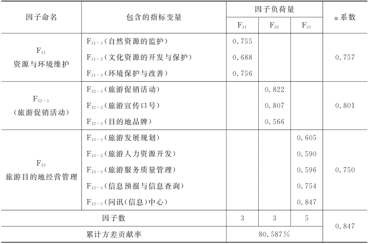 三个公共因子的累计方差贡献率为80.587%,三个公共因子的α值均大于0.7,11项指标的信度也在0.8以上,以上数值表明对目的地管理因素所做的因子分析结果较令人满意。可以将三个公共因子分别命名为:资源与环境保护、旅游目的地营销与旅游目的地经营管理。