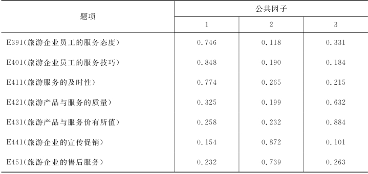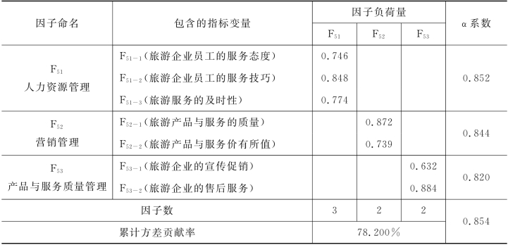 上述第一次因子分析以及信度检验部分均未删除任何题项,第二次因子分析的结果与第一次相同,如表4-41所示。三个公共因子的累计方差贡献率为78.200%,三个公共因子的α值均大于0.7,10项指标的信度也在0.8以上,以上数值表明对旅游企业管理因素所做的因子分析结果较令人满意。可以将三个公共因子分别命名为:旅游企业人力资源管理、营销管理以及产品与服务质量管理。