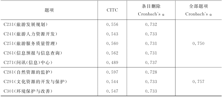 旅游企业管理因素的条目删除Cronbach's α系数检验结果如表4-40所示,三个提取因子的组成题项在删除题项之后的α值均小于全部题项的α值,所以不需删除任何题项。