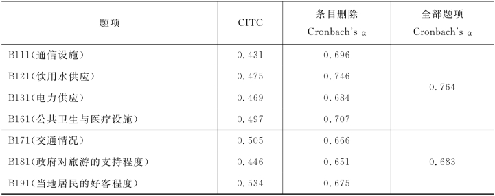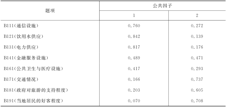 从旋转后的因子负荷矩阵(表4-26)可以看出,各题项的因子负荷均在0.4以上,但是由于B141(金融服务设施)在两个公共因子上的负荷均超过了0.4,需要将其删除,经调整最后保留8个题项。