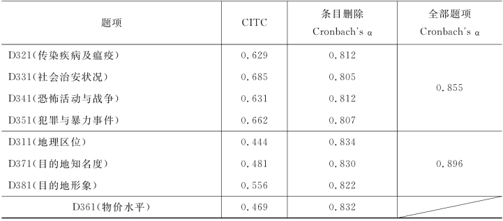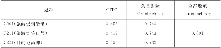 目的地管理因素的条目删除Cronbach's α系数检验结果如表4-32所示,三个提取因子的组成题项在删除题项之后的α值均小于全部题项的α值,所以不需删除任何题项。