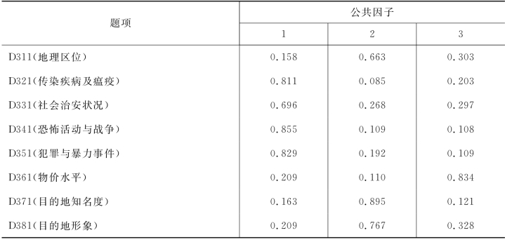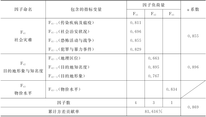 限制性与放大性因素的三个公共因子的累计方差贡献率为81.616%,F41、F42的α系数分别为0.855和0.696。由于F43公因子只含有一个指标,而物价水平又非常关键而不能剔除,SPSS13.0无法提供F43的α系数,但总体的α系数为0.839足证其内部一致性较强,置信度较高。根据各题项的特点,将三个公共因子命名为:社会灾难、目的地形象与知名度、物价水平。