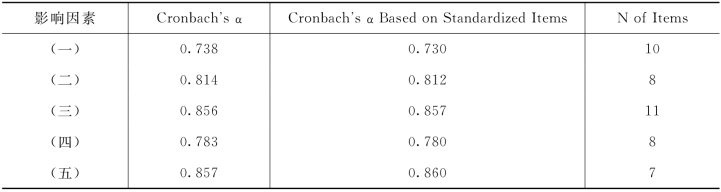 表4-20 五组影响因素的Cronbach's α系数和标准Cronbach's α系数