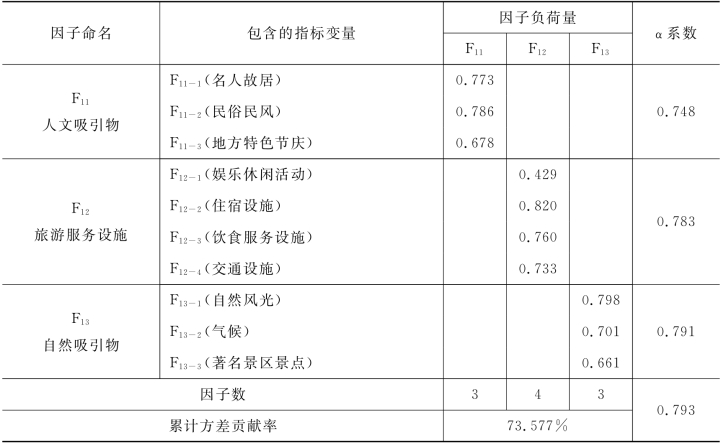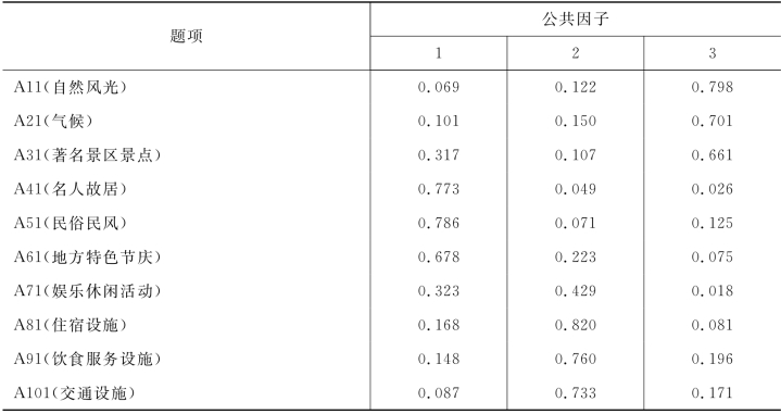 由于上述第一次因子分析以及信度检验部分均未删除任何题项,所以第二次因子分析的结果与第一次相同,如表4-24所示。三个公共因子的累计方差贡献率为73.577%,这说明三大因子涵盖了原有指标的大部分信息;并且各公共因子的α系数均大于0.7,10项指标的信度系数为0.793,均在可接受范围之内。根据各项核心资源与吸引物因素的特点,将三个公因子分别命名为人文吸引物、旅游服务设施和自然吸引物。