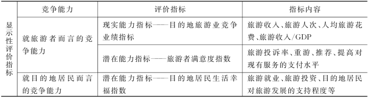 综上所述,本文所构建的旅游目的地竞争力评价指标体系共包含分析性指标和显示性指标两套指标。就旅游者而言的竞争力能力可以通过分析性指标和显示性指标共同衡量;就目的地居民而言的竞争能力仅通过显示性指标衡量,这是因为目的地居民生活质量的提升受诸多因素的影响,旅游发展仅仅是其中之一,此处对其分析性指标不作涉及。