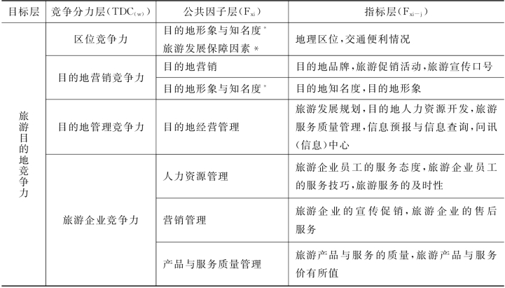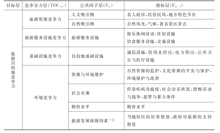 由于现有文献中涉及的影响因素太过庞杂,不可能将其全部罗列在指标体系之中,而因子分析可以达到精简变量的目的。第四章有关旅游目的地竞争力影响因素所做的因子分析,为分析性指标体系的构建做好了准备工作。