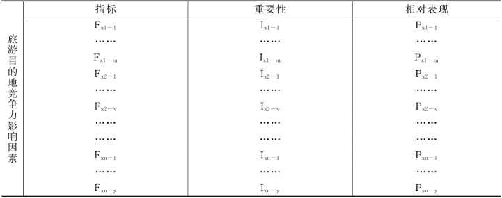 在对前往某些旅游目的地旅游的国内游客进行调查时,除了涉及游客对各种影响因素重要性的评价之外,还涉及游客对被调查目的地各种影响因素的实际表现情况的评价。如表5-2所示,x表示第x类旅游目的地竞争力影响因素,x=1,2……5;n表示第x类影响因素可以提取出n个公共因子,这些公共因子分别含有m个、v个……y项指标。