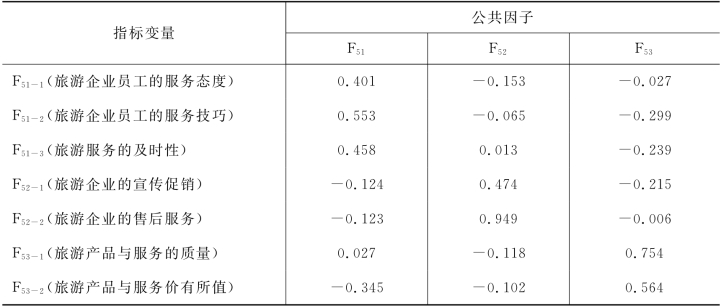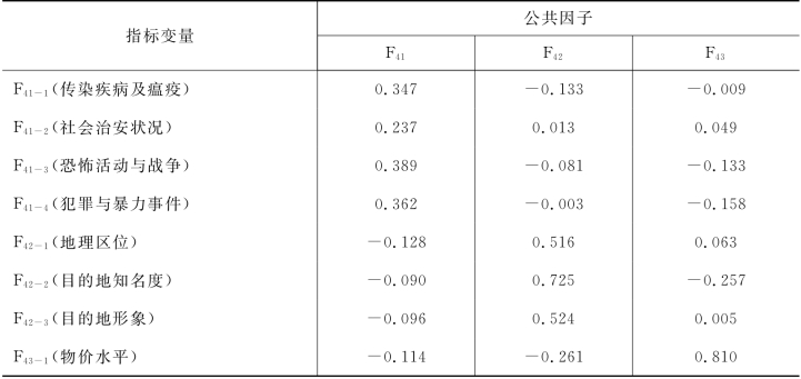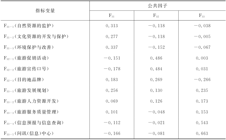目的地管理因素共提取三个公共因子,各个公共因子所含指标的因子得分系数矩阵参见表5-8。