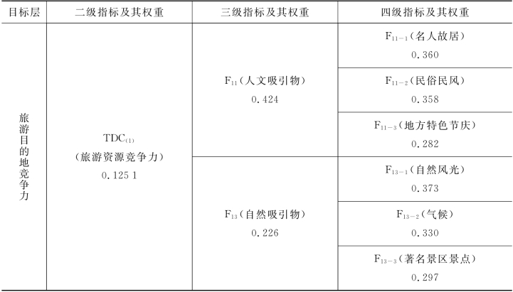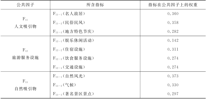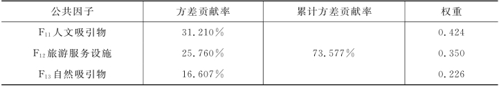 核心资源与吸引物因素的三个公共因子分别为F11人文吸引物、F12旅游服务设施和F13自然吸引物,其方差贡献率分别为31.210%、25.760%和16.607%,三个公共因子的累计方差贡献率为73.577%。根据公式5.2,三个公共因子的权重分别为31.210%/73.577%、25.760%/73.577%、16.607%/73.577%,即0.424、0.350和0.226,汇总于表5-14。