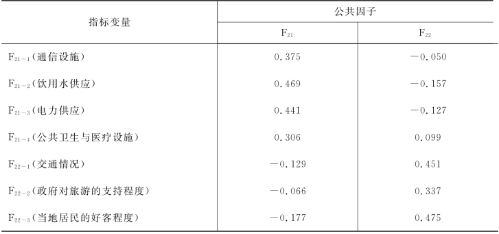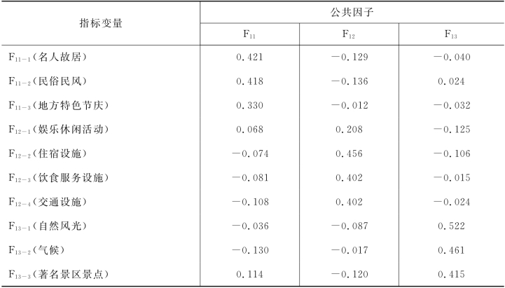 核心资源与吸引物因素共提取3个公共因子,各项指标的因子得分系数矩阵(Component Score Coefficient Matrix)如表5-4所示,对第一个公共因子F11(人文吸引物)而言,共包含F11-1(名人故居)、F11-2(民俗民风)和F11-3(地方特色节庆)三项指标,这三项指标的因子得分系数分别为0.421、0.418和0.330。