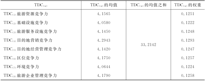 第二层指标是旅游目的地竞争力的分力层TDC(w),其权重的确定主要依据各分力所包含的公共因子及其指标的均值。参照公式5.1,将各种竞争分力的权重汇总于表5-19。