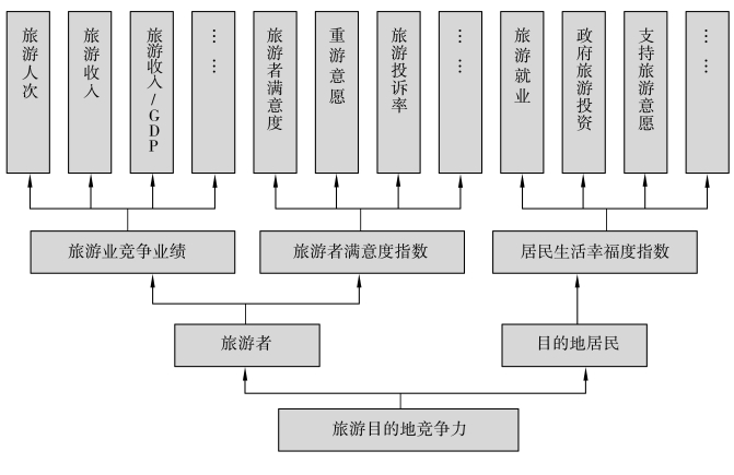 旅游人数与旅游收入是国内外学者一致认可的旅游业竞争业绩评价指标。Dwyer把旅游对当地就业的贡献、对当地经济的贡献、旅游投资、政府对旅游发展的支持等也作为目的地竞争业绩的评价指标[2]。此外,考虑到不同旅游目的地在地理面积、人口密度、经济水平等方面的差异,笔者认为除了考虑旅游收入、旅游人数等的总量指标之外,还需考虑人均指标、面积平均指标以及单位GDP指标等相对指标。基于此,衡量目的地旅游业竞争业绩的指标应该包括旅游人次、旅游收入、人均旅游花费、万人居民旅游收入、万人居民旅游人数、平方公里旅游收入、平方公里旅游人数以及旅游收入/GDP等内容;旅游者满意度指数应该包含旅游者总体的满意度、重游意愿、推荐意愿、提高支付水平的意愿以及投诉比率等指标;而目的地居民生活幸福度指数则包含旅游就业、政府旅游投资、目的地居民对旅游发展的支持程度等指标(见图5-1)。