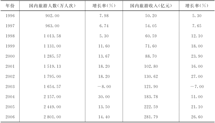 近年来,青岛市国内旅游经历了一个突飞猛进的发展过程。就旅游人数而言,2006年比2001年增长了84.4%,截至2006年青岛市国内旅游人数达到2 801万人次;就旅游收入而言,2006年比2001年增长了174.1%,截至2006年青岛市国内旅游收入达到281.79亿元[2],青岛市1996~2006年国内旅游的基本情况可参见表6-1。