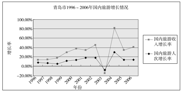总的来说,1996~2006年期间,青岛市国内旅游人数和旅游收入分别以平均每年11.96%和18.33%的速度增长[3],具体情况参见图6-3。除2003年受“非典”影响之外,青岛市国内旅游的增长率无论是在旅游人数还是在旅游收入方面都基本保持了递增趋势。