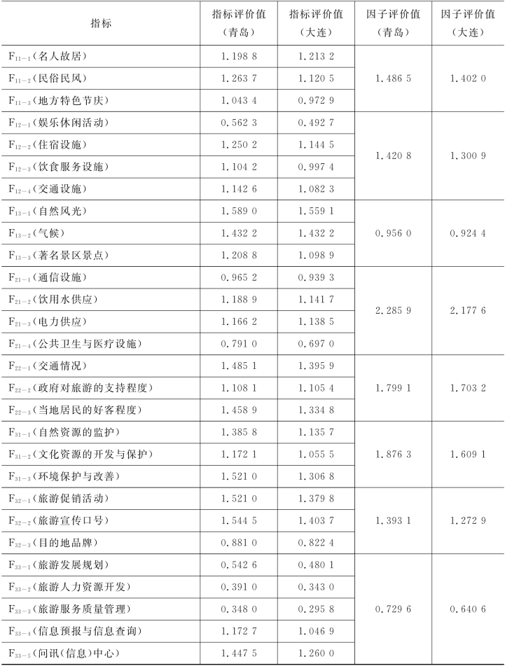 结合表6-4、6-5、6-9及6-10的内容,现将青岛与大连旅游目的地竞争力分析性指标的第三、第四层次评价值列于表6-13中,青岛旅游目的地竞争力的各项指标评价值、因子评价值均大于大连。