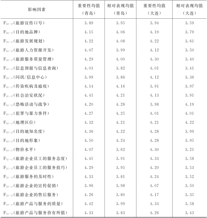 表6-16 青岛与大连旅游目的地竞争力影响因素“重要性”与“相对表现”均值