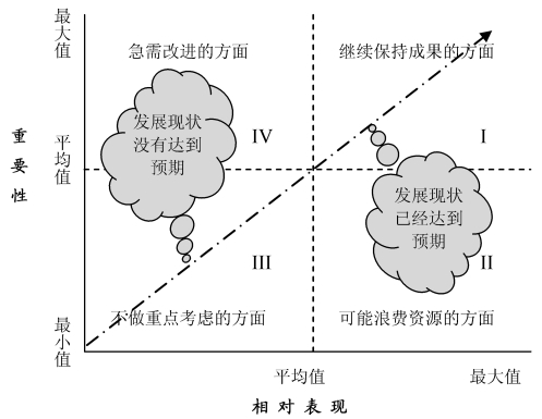 方格图中间的带箭头的45°虚线是划分分析对象发展现状是否达到预期的界限,落在线的左边的指标意味着分析对象在这些项目上的现实表现或发展现状不能令人满意;而落在线右边的指标说明分析对象在这些项目上已经超过了人们的期望;正好落在线上的指标则意味着分析对象在这些指标上基本达到了期望要求。