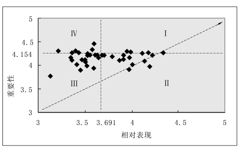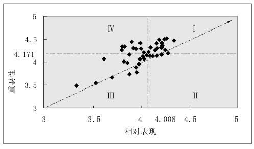 IPA分析法具体的操作步骤包括:第一步,确定所要考核的观测变量和考核分值范围;第二步,分别确立各观测变量的重要性及其相对表现的分值,画出标有刻度的IP图;第三步,分别求出观测变量重要性及其相对表现各自总的平均数(Grand Mean)或中值(Median),并找出两个平均数(或中值)在IP图中的确切交叉点,然后基于该交叉点画出一个十字架,虚线横轴代表的是实际表现轴,虚线纵轴代表的是重要性轴,IP图的四个象限便清晰地显示出来;第四步,分别将各观测变量,根据其重要性和相对表现的实际得分,逐一定位在四个象限相应的位置;第五步,根据不同象限中各观测变量的特点提出相应的对策和建议[18]。