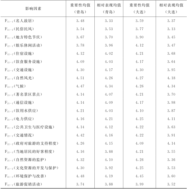 首先借助SPSS13.0统计软件整理出两个旅游目的地在各种影响因素“重要性”与“相对表现”方面的均值,如表6-16所示。