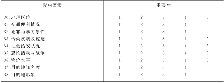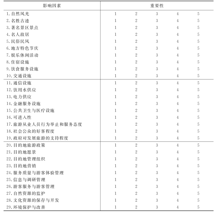 填写说明:问卷中的“重要性”表示左侧的影响因素项目在提升旅游目的地竞争力过程中的重要程度(“1”=很不重要,“2”=不重要,“3”=一般,“4”=重要,“5”=很重要),请按照您的真实感受以“红色字体”标出!