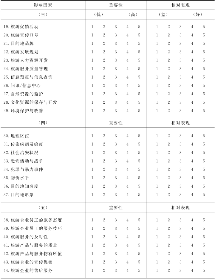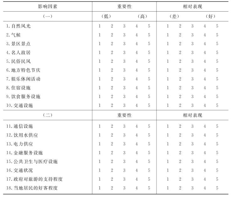 填写说明:问卷左侧列出的是影响青岛对您的“吸引力”的各种因素;中间的“重要性”表示这些因素的重要程度(“1”=很不重要,“2”=不重要,“3”=一般,“4”=重要,“5”=很重要);右边的“相对表现”则是青岛在这方面的实际表现情况(“1”=很差,“2”=较差,“3”=一般,“4”=较好,“5”=很好)。请按照您的真实感受填写!