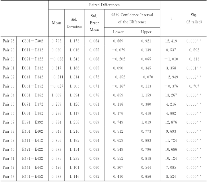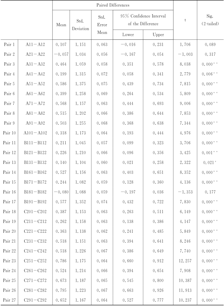 附录G 大连旅游目的地竞争力影响因素“重要性”与“相对表现”配对样本T检验结果