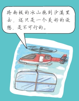 将南极的冰山拖到沙漠里去,现在还只是一个美好的设想而已,但是相信不久的将来,海洋里的冰山一定可以为人们所利用,解决人类的水源危机。