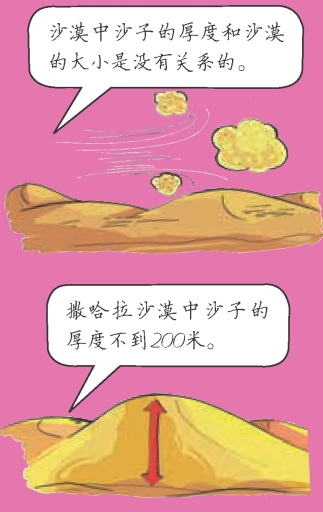 沙漠表面的沙子是堆积在土层之上的,厚度很少超过200米。只要不是覆盖在古老的山谷和干涸的湖泊之上,沙子的厚度一般都不会超过这个限制。世界上最大的撒哈拉沙漠也是这样,虽然看上去到处都是沙子,但实际上沙子的厚度也没有达到200米。