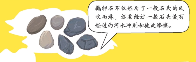 鹅卵石也是石头的一种,一般石头的经历它都有过,只是它的形成过程更加复杂。接下来,说说鹅卵石的形成。河流大多在山上发源,陡峭的山势,会使水流湍急。急流的河水是河道中石头的搬运工,大块的石头被急流冲得支离破碎。这些破碎的小石块,彼此挤压着随河水滚动,由于不断相互摩擦,身上的棱角也被一点点磨圆。而且,随着流动的河水,它们变得越来越小,越来越圆。到了地势平坦的地区,那些棱角分明的大石头不见了,只剩下一颗颗圆圆的鹅卵石在河水中慢慢地移动。这样看来,鹅卵石不仅经历了一般石头的风吹雨淋,还要经过一般石头没有经过的河水冲刷和彼此摩擦,就是这个过程,使它没有了一般石头不坚硬的“外套”,把石头最硬的部分剩下了,这最硬的部分就是鹅卵石。