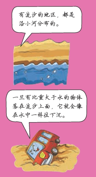 这些吃人的沙子,人们称之为“活沙”或“流沙”。科学家发现,有流沙的地区,都是沿着小河分布的。沙上长着斑驳的黄绿色苔藻。科学实验发现:流沙是由于旁边小河中的水从沙子的底部向上渗透到沙粒中而产生的。就如同沙子的下面有一个泉眼,使大量的水向上涌。由于水流的上冲力,使沙粒互相膨胀分开。沙粒不再重叠,而是被水托着,呈半漂浮状态。因此,一旦有比重大于水的物体落在上面,便会像在水中一样往下沉。沙粒越细,上涌的水流越大,所形成的流沙越危险;反之,沙粒越粗,上涌水流越微弱,形成的流沙危险性越小。流沙往往不易被人发现,因此人们称它为“死亡的陷阱”。