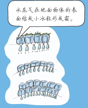 到了夜晚,地面上的草、木、石块等物体由于向外辐射热量,所以自身的温度会降低,当温度降至露点(水汽液化成露的温度)时,地面物体附近的空气中含有的水蒸气就会达到饱和。如果露点高于0℃,水蒸气就会在地面物体的表面上凝结成小水滴,这就是露;如果露点低于0℃,水蒸气就会在地面物体的表面上结成小冰粒,这就是霜。