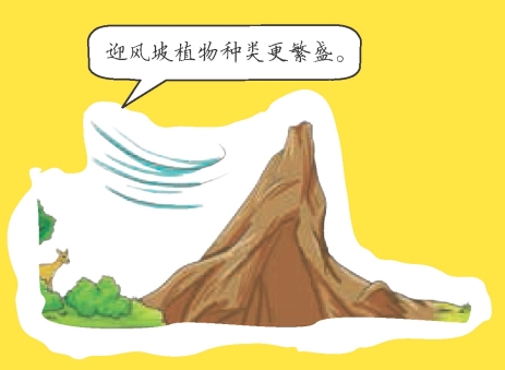 迎风坡因降水量充沛,温差变化小,为植物的生长提供了良好的环境。而植物种类的繁盛,为动物的生活提供了栖息之地和食物,因此也能吸引来众多的动物到此繁衍。背风坡却因为降水较少,白天和黑夜温度变化大,生活环境相对艰苦,植物和动物的种类相比迎风坡少很多。