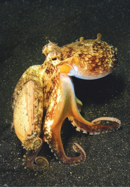 研究表明,章鱼有三个心脏、两个记忆系统、五亿个神经元,大量非常敏感的、化学的和触觉的感受器,以及非凡的学习和思维能力,它是这个星球上最聪明、最狡猾的无脊椎动物。很多章鱼在实验室里会走迷宫,会辨认形状,有长期和短期记忆。有的章鱼甚至还会“双足”行走!要知道,科学理论认为,只有两种构造才能促成“双足”移动现象发生:一种是拥有坚硬的骨骼和可自由伸缩的骨骼肌;另一种则是有关节来协调肢体运动,使之行走。显而易见,章鱼的腕足并没有关节,也没有什么骨骼或骨骼肌,但它却神奇地做到了这一点。还有一种章鱼甚至会使用工具——它会带着捡拾到的被丢弃的椰子壳,遇到紧急情况就把椰子壳扣在一起当作房子钻进去。小朋友们,你们知道吗?人之所以能够从猿进化为人,会使用工具是原因之一……幸运的是,章鱼目前还仅仅是章鱼,没有向章鱼人进化的意思,否则,我们真该担心了。