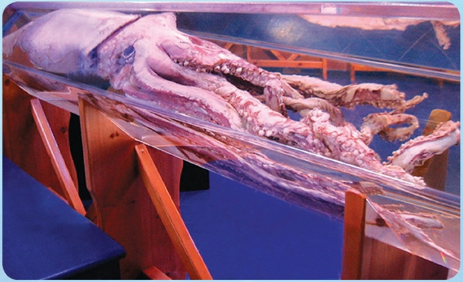 传说中的大王乌贼只在深海中游弋,难得在我们人类面前露出真容。在北大西洋和北太平洋都有大王乌贼出没的蛛丝马迹,科学家们相信,这种可怕的乌贼是世界上体形最大的无脊椎动物之一。与“近亲”八腕目的章鱼相比,属于十腕目的大王乌贼不仅仅是多了两条腕足,背上还多了一块船形的硬乌贼骨,看上去可比章鱼威风多了。