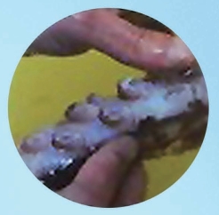 大王乌贼有三颗强劲有力的心脏,给其庞大的身体提供动力。和章鱼一样,大王乌贼拥有强大的腕足,但它们的腕足比章鱼更有力,因为每条腕足上都有上百个令人恐怖的吸盘,每个吸盘都和一个成年人的手掌差不多大。吸盘边缘还有一圈小型锯齿,可以牢牢咬死吸住的东西。如果这些吸盘牢牢吸在你皮肤上会是什么结果?不仅会留下一个个红肿的印子,还会被撕掉一大块皮和肉,非常疼,想想就很可怕。人们在巨大的抹香鲸身上经常会看到很多圆形的伤疤,那就是大王乌贼腕足的杰作。而这些伤疤中的肉则都被大王乌贼吸走了。