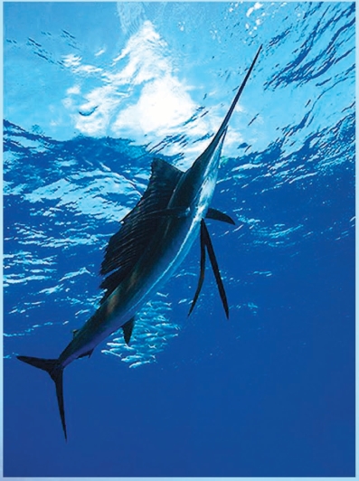 旗鱼的外形帮助它们夺得了海洋游泳的冠军!它们游泳的时候,放下的背鳍减少了海水阻力;长剑般的吻突将海水很快向两旁分开;不断摆动的尾鳍仿佛船上的推进器。这一切的完美组合,成就了旗鱼堪比小轿车狂奔时候的游泳速度。