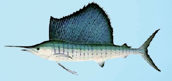 旗鱼的外形很独特,你一眼就能把它们认出来。因为它们的吻突(上嘴唇向前突出的部分)又长又尖,好像一把利剑。而它们的第一背鳍高高耸立,仿佛是船上扬起的一张风帆,又像是扯着的一面旗帜,旗鱼正是因此得名。