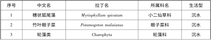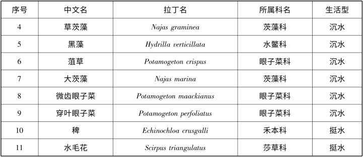 采集到11 种大型水生植物(见表2 -4),其中9 种沉水植物,2 种挺水植物。