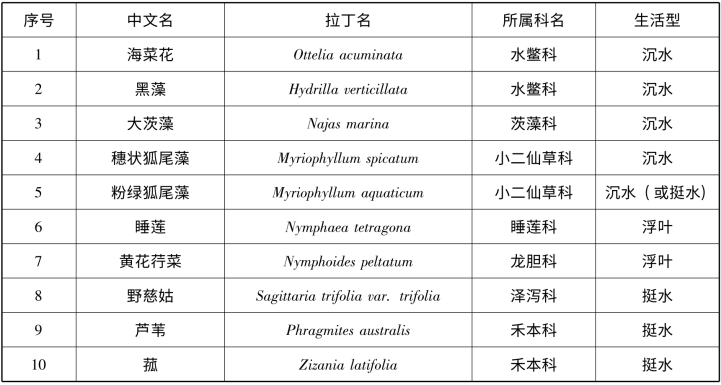 采集到10 种大型水生植物(见表3 -2),其中5 种沉水植物,2 种浮叶植物,3 种挺水植物。