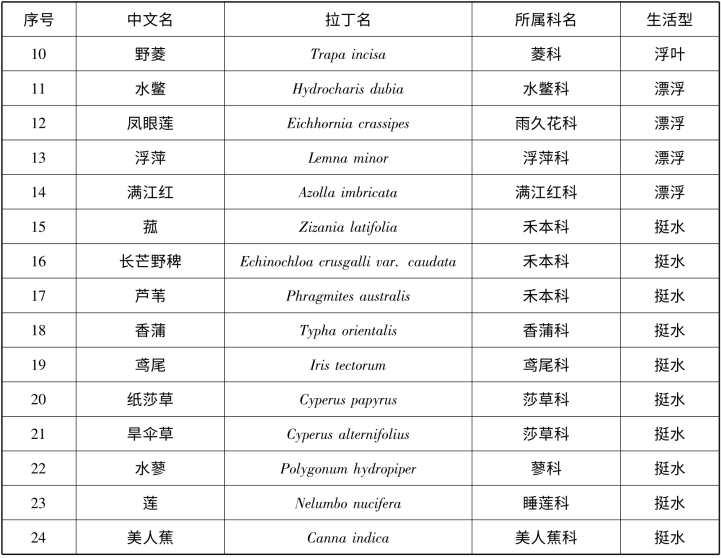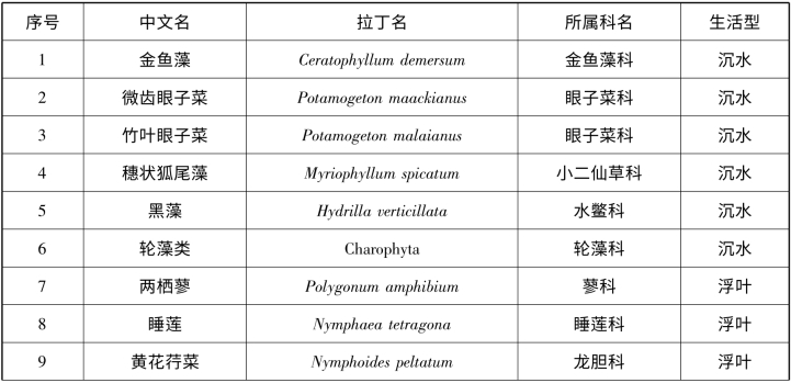 采集到24 种大型水生植物(见表3 -4),其中6 种沉水植物,4 种浮叶植物,4 种漂浮植物、10 种挺水植物。