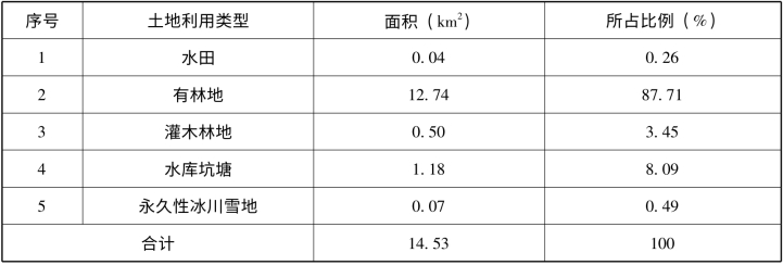 流域内主要的土地利用类型为有林地,约占流域总面积的88%;其次是水面面积和灌木林地等。土地利用状况见表3 -7。