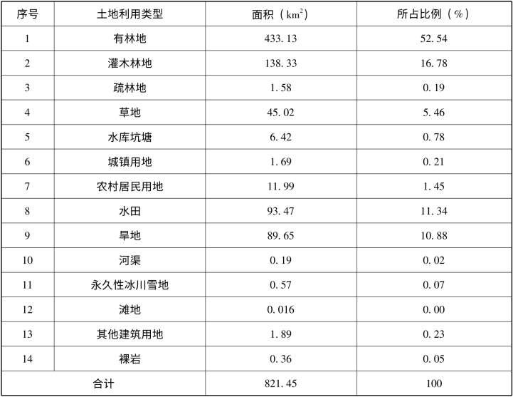 流域内主要的土地利用类型为有林地,约占流域总面积的53%;其次是灌木林地、水田和旱地等。土地利用状况可参见表3 -9。