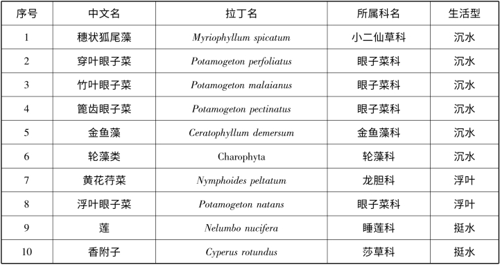 采集到10 种大型水生植物(见表3 -12),其中6 种沉水植物、2 种浮叶植物、2 种挺水植物。