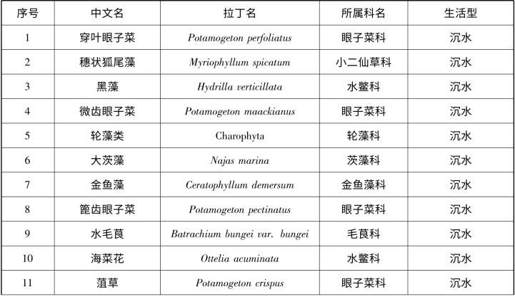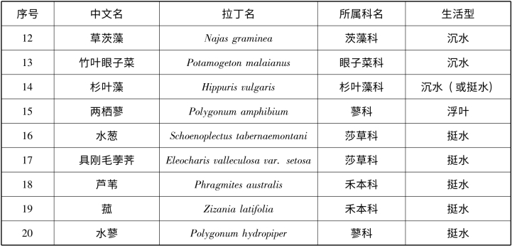采集到20 种大型水生植物(见表3 -16),其中14 种沉水植物、1 种浮叶植物、5 种挺水植物。