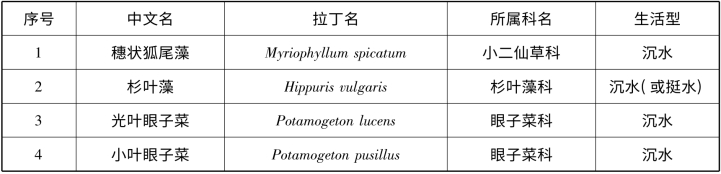 采集到4 种大型水生植物(见表3 -20),均为沉水植物。