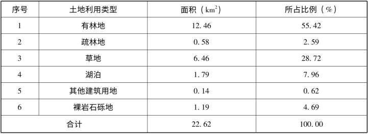 流域内主要的土地利用类型为有林地,约占流域总面积的55%;其次是草地、湖泊等。土地利用状况见表3 -21。