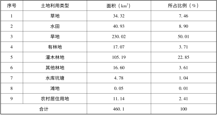 流域内主要的土地利用类型为旱地,约占流域总面积的50%;其次是灌木林地、水田等。土地利用状况见表4 -5。