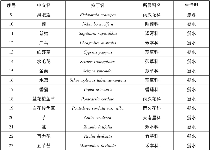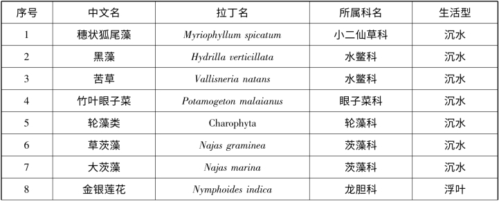 采集到23 种大型水生植物(见表4 -7),其中7 种沉水植物、1 种漂浮植物、1 种浮叶植物、14 种挺水植物。
