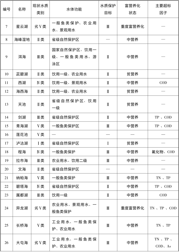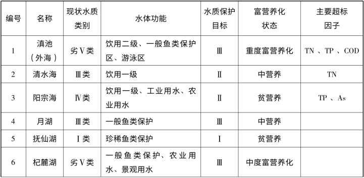 表5-1 云南高原湖泊现状水质及富营养化状态